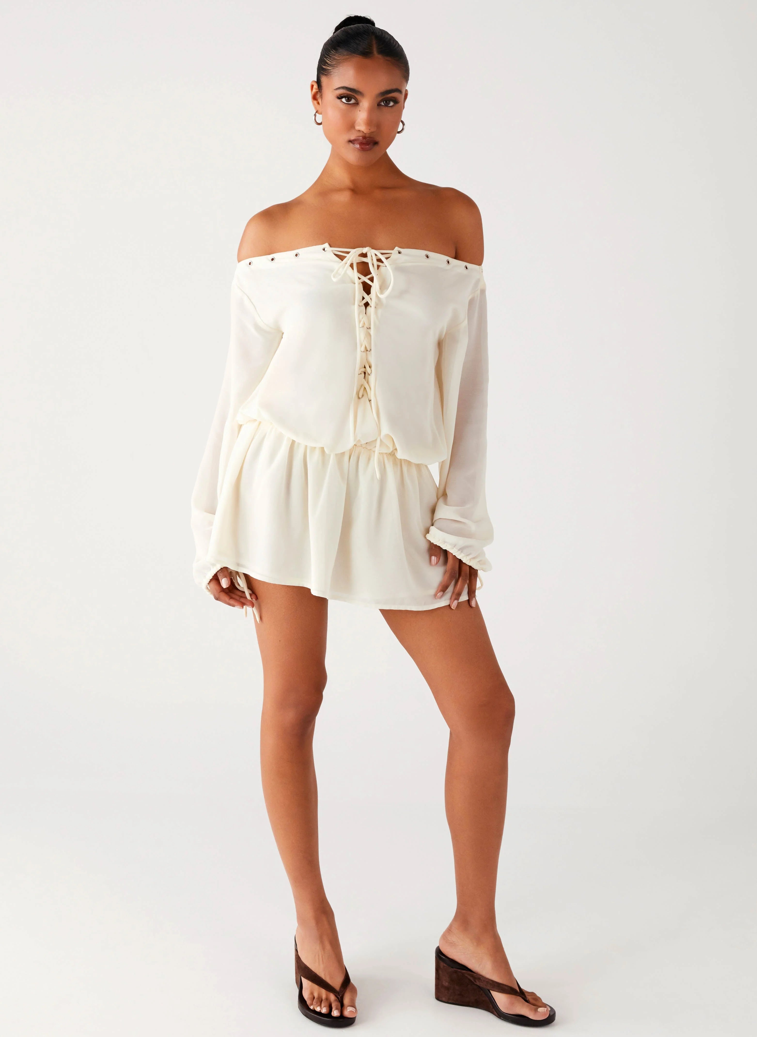 The Astaria Mini Dress is made for breezy nights and effortless style. Featuring an off-shoulder neckline with front eyelets and tie, it’s finished with an elasticated waistband and flared skirt. Semi-sheer and self-lined for the perfect balance.
