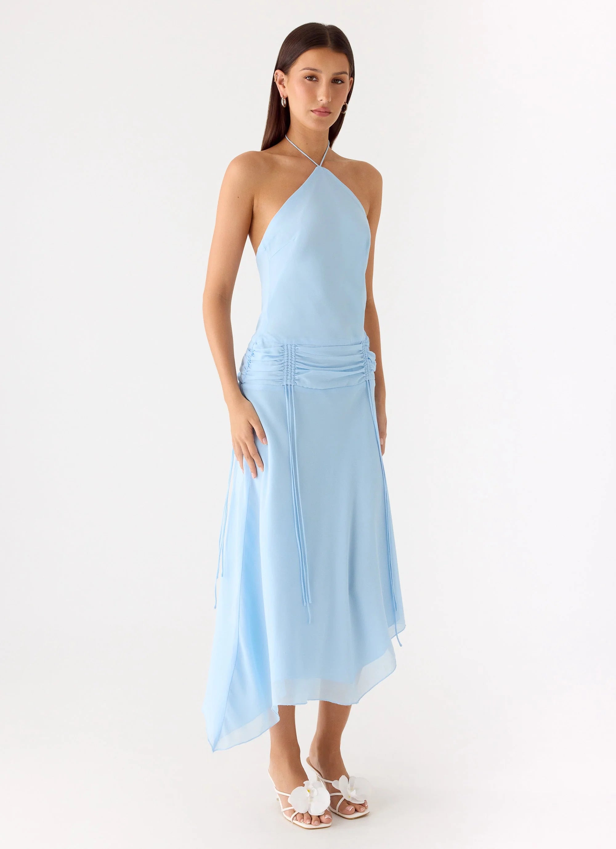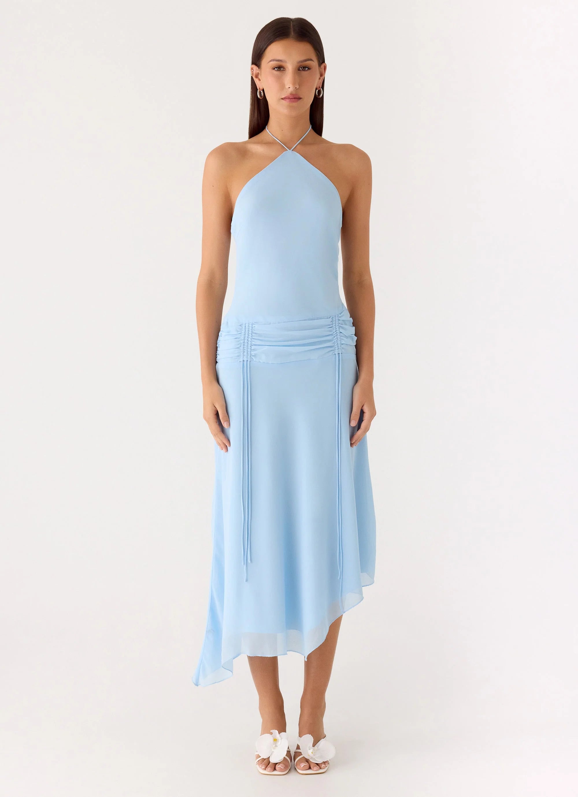 The Becerra Chiffon Midi Dress is made for golden hour escapes and evening soirees. With a halter neckline, adjustable ruched drawstring, and an asymmetrical hemline, this fully lined midi dress combines effortless movement with a feminine silhouette. Perfect for beach-to-bar transitions or sunset soirées.