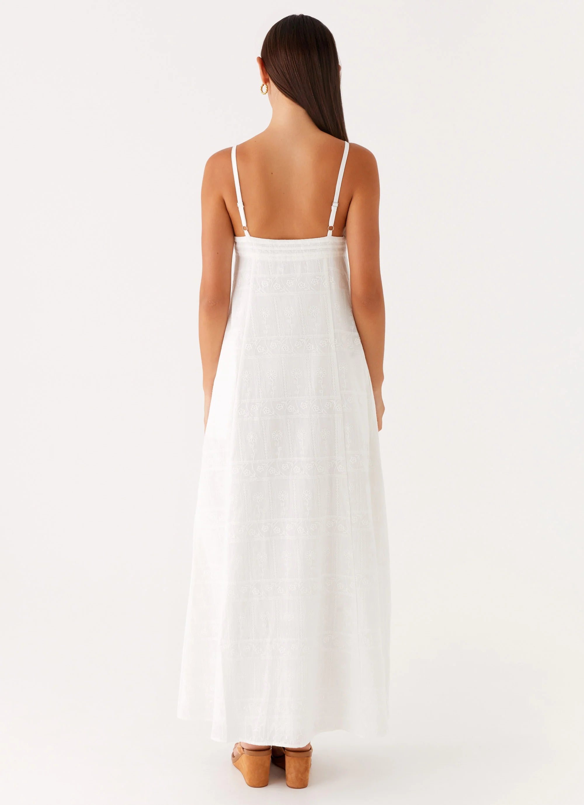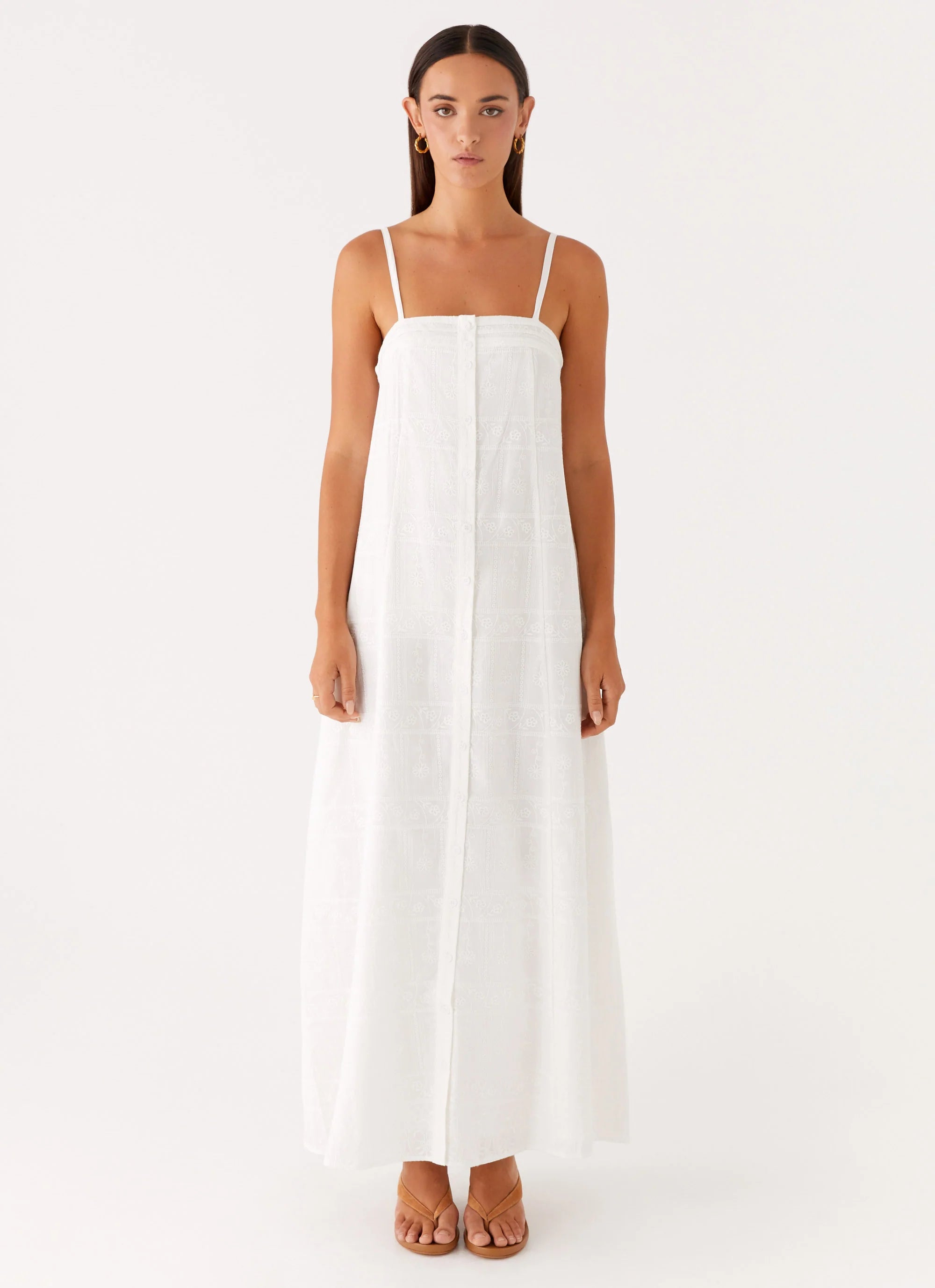 The Cole Maxi Dress features a flattering square neckline, front button detailing, and a relaxed, loose fit. Perfect for effortless style, it flows elegantly with every step, making it an ideal piece for laid-back evenings or sunny days.