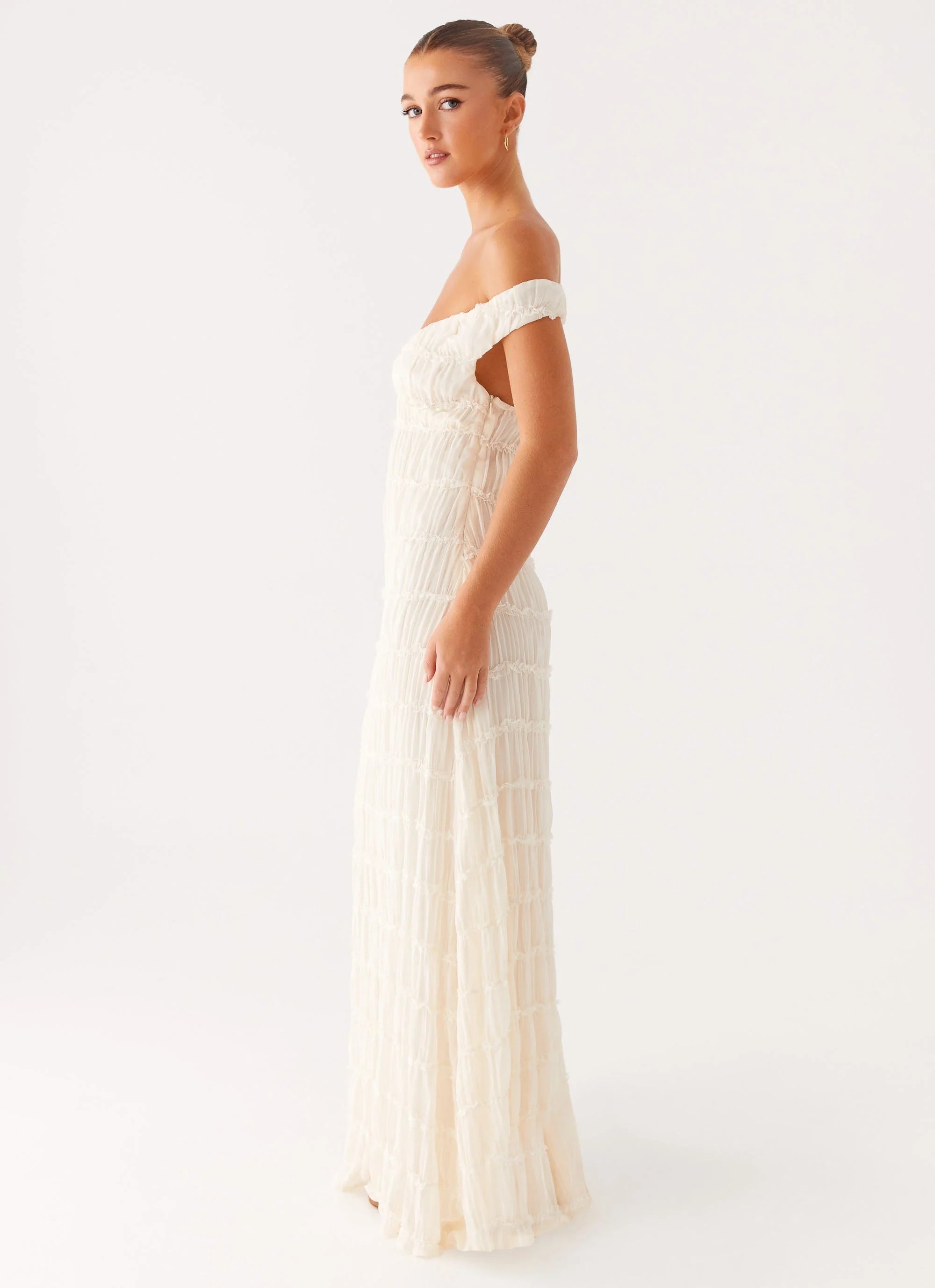 A romantic off-shoulder maxi dress crafted from textured fabric. Featuring an elasticated back strap for comfort and a fully lined silhouette for a seamless finish.