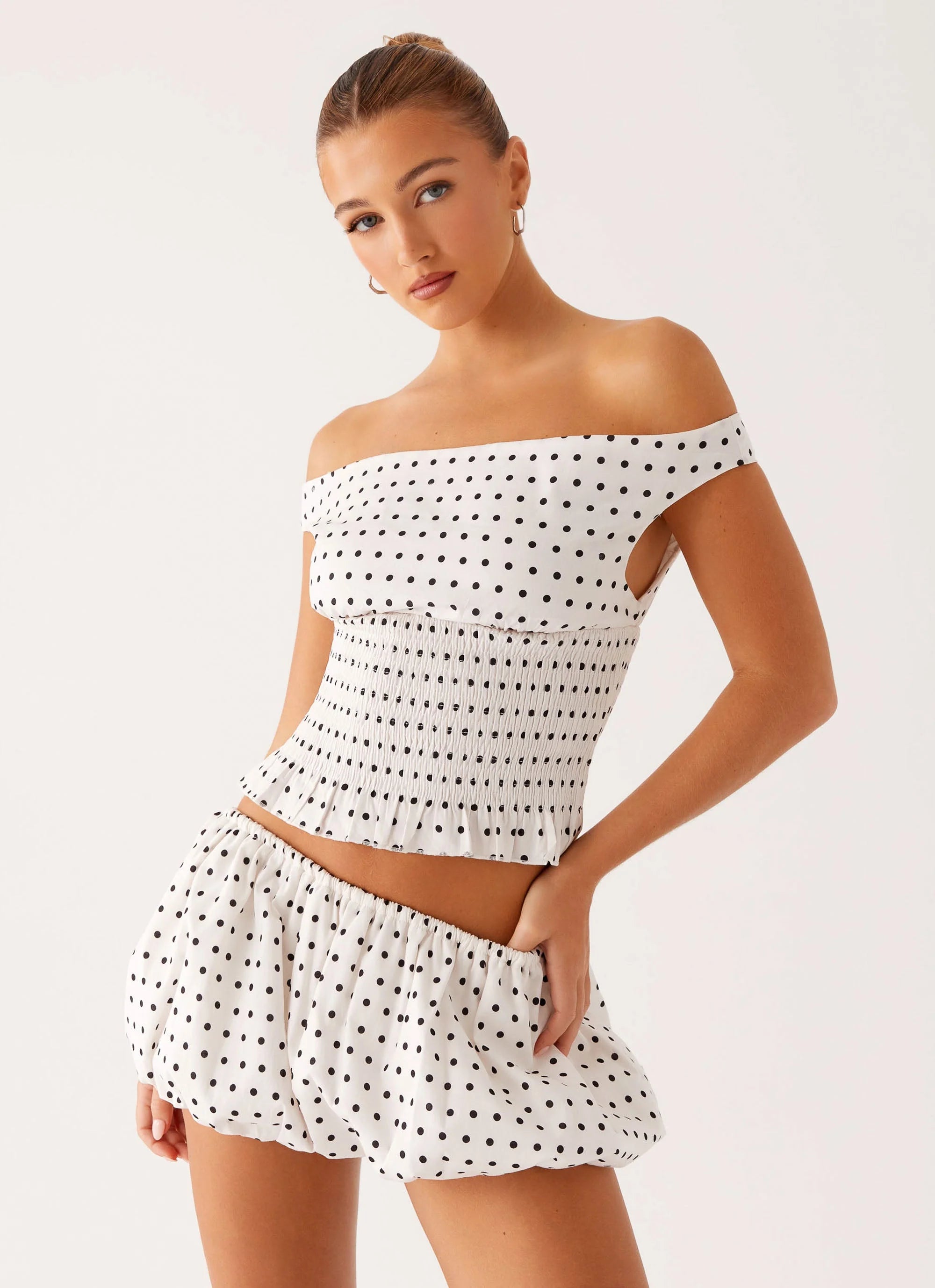 Bold moves and soft moments — the Heather Off Shoulder Top in White Black Polka Dot is made for unforgettable nights. With an off-the-shoulder neckline, shirred underbust bodice, and a semi-fitted full length, it’s the perfect balance of elegance and edge.