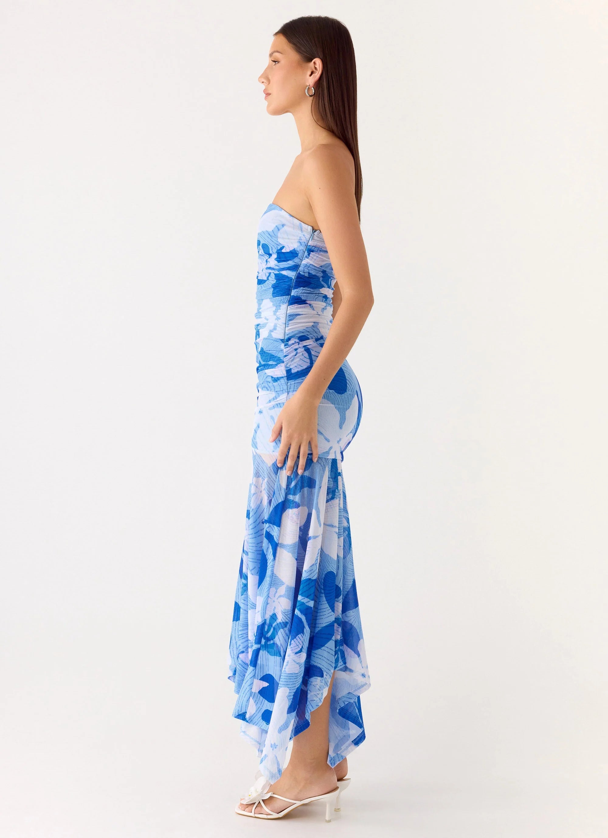 The Lo Siento Midi Dress is made for sunset dinners and after-dark wandering. Designed in a strapless silhouette with a gathered bodice and mesh overlay, it skims the body with a soft stretch finish and flows with every step. Fully lined with jersey for comfort, it features our exclusive print and a secure fit with gripper tape and invisible closure detailing.