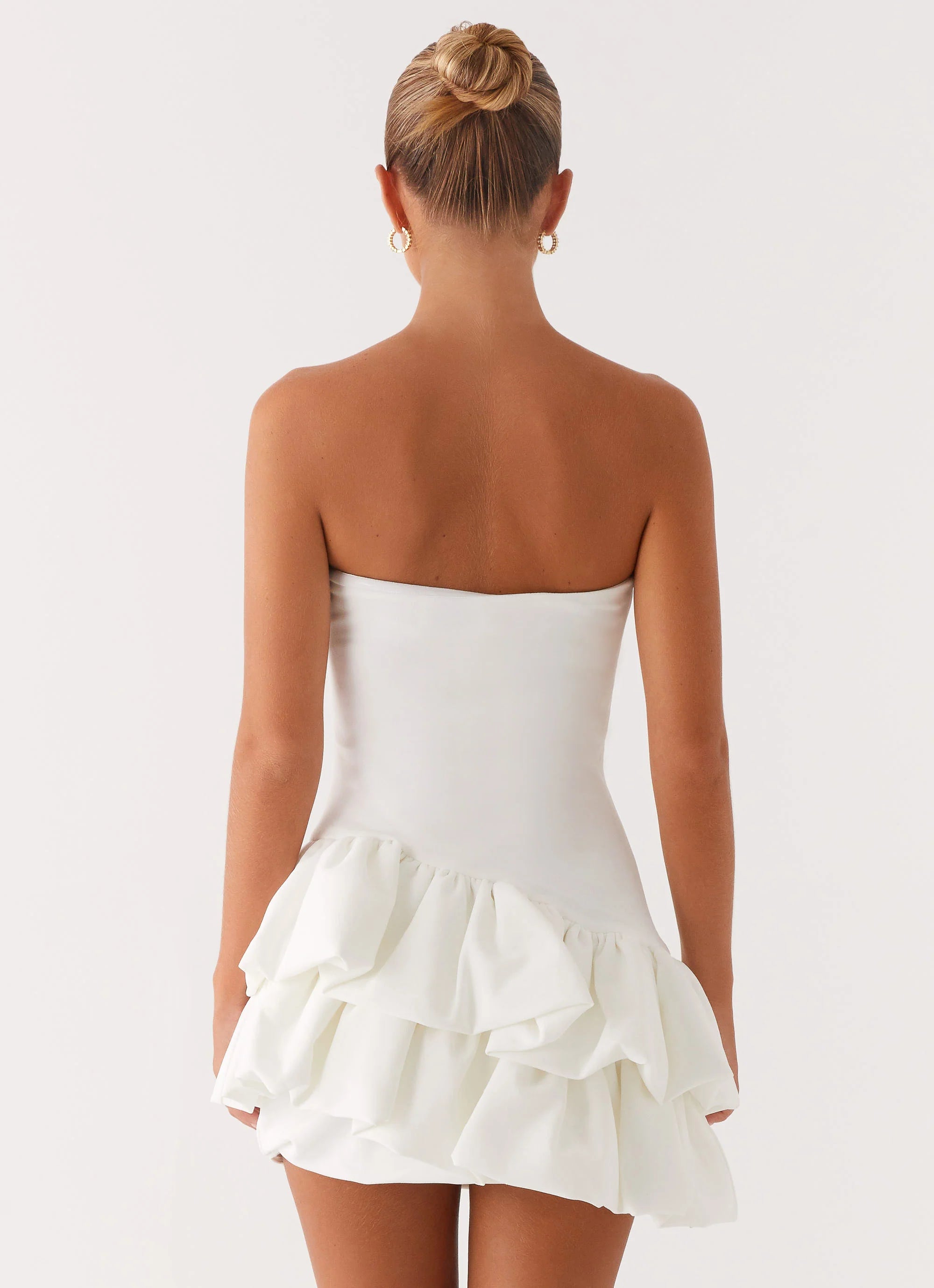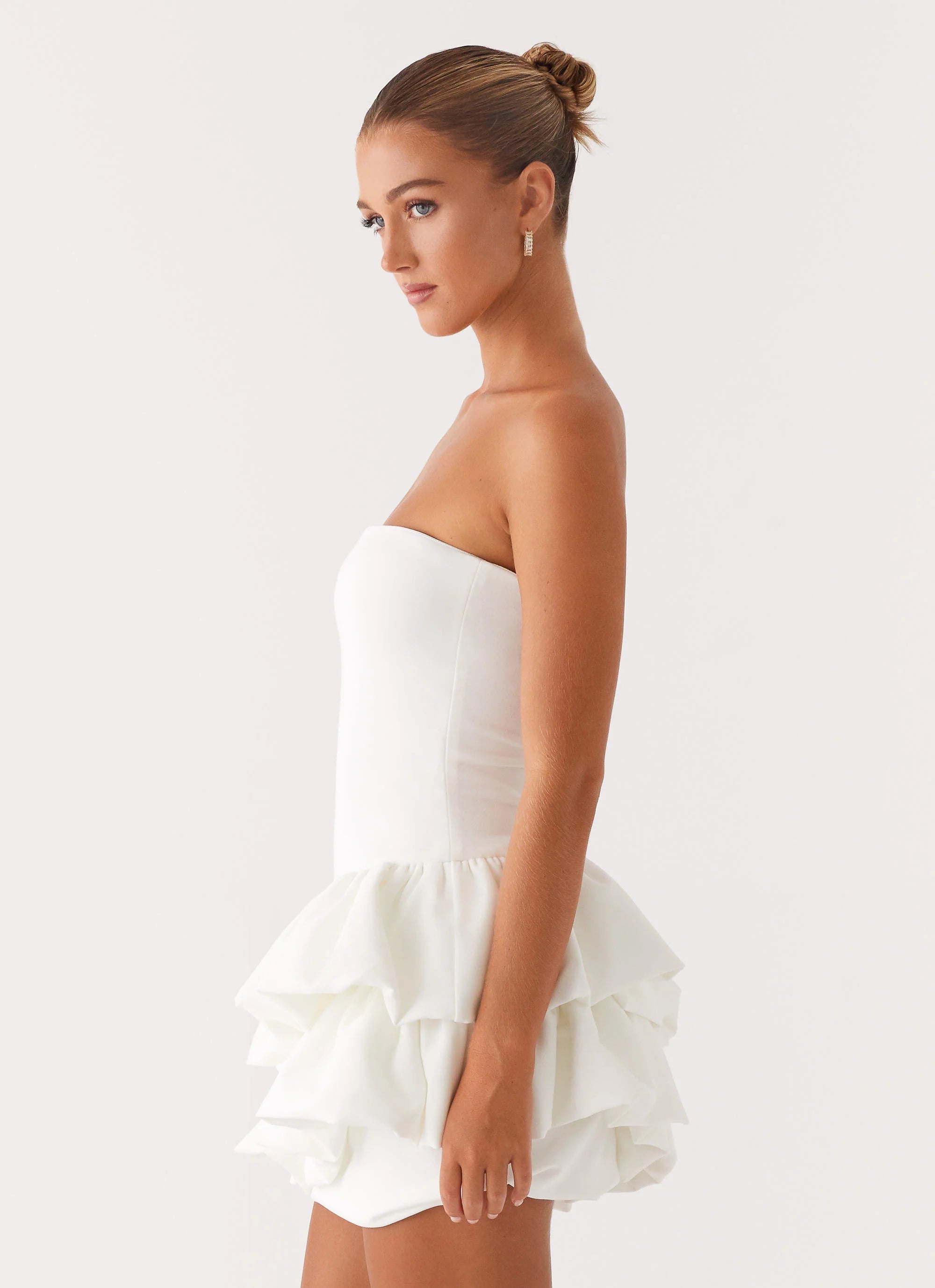 The Marie Mini Dress features a strapless neckline and a tiered ruffle hem, creating a playful yet elegant look. Perfect for summer days or casual evening outings, this dress offers a flattering fit with a fun, feminine flair.
