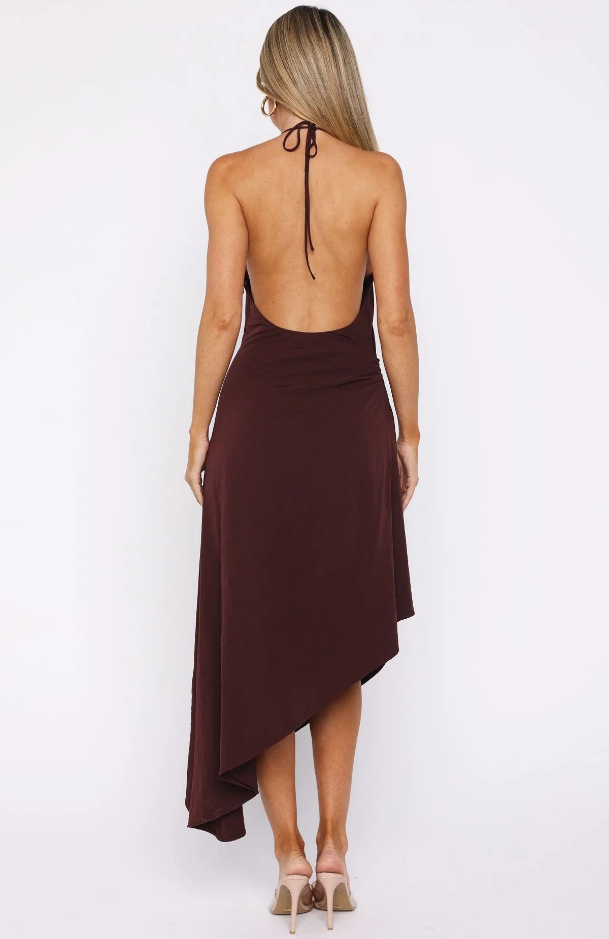 Be Santa's cutest helper in the Night Hustle Halter Midi Dress Burgundy! Features halter straps, a high neckline that balances its daring backless silhouette, and flattering ruching at the hips. The asymmetrical hemline adds modern flair, while a side zipper with hook-and-eye closure ensures a seamless finish. Fully lined for comfort. Style with simple heels and you are ready for festive magic.
