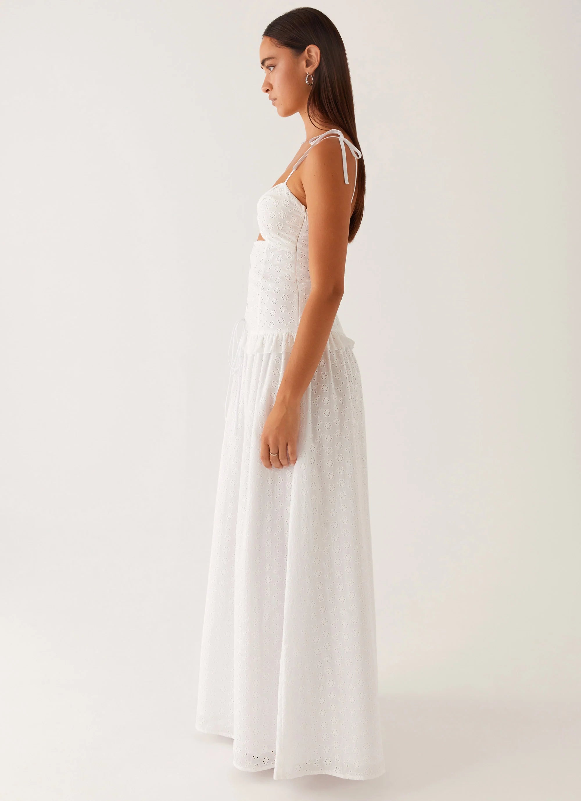The Reveria twist maxi dress is a vision of effortless elegance. With thin straps and a drop waist accentuated by a ruffled waistband, it drapes beautifully for a flattering silhouette. Perfect for evenings that call for a touch of romance and movement, this dress is made to turn heads from sunset to starlight.