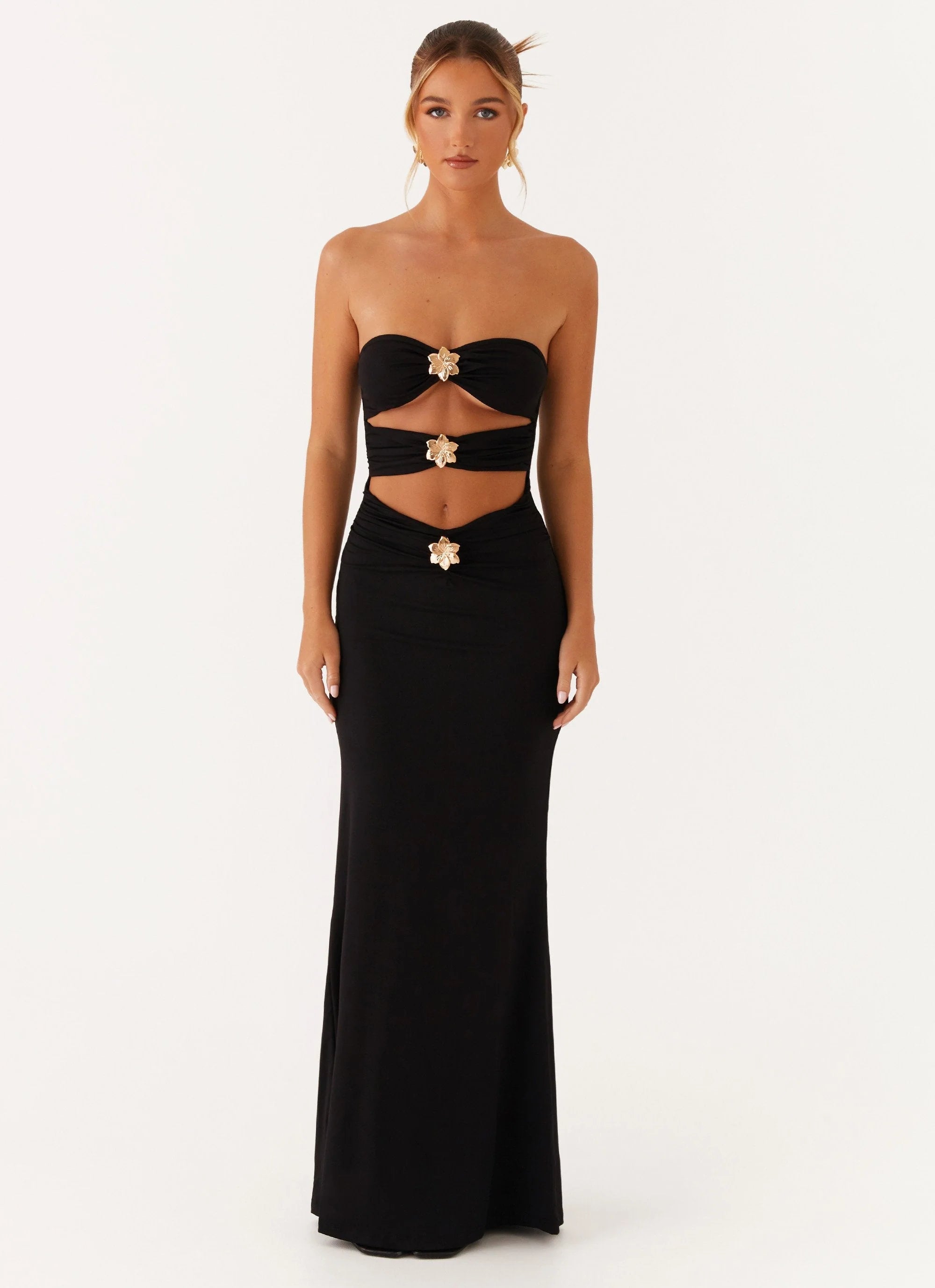 The Save Me Maxi Dress features a strapless neckline with silicone taping for a secure fit. Its sleek design ensures elegance and comfort, perfect for any special occasion.