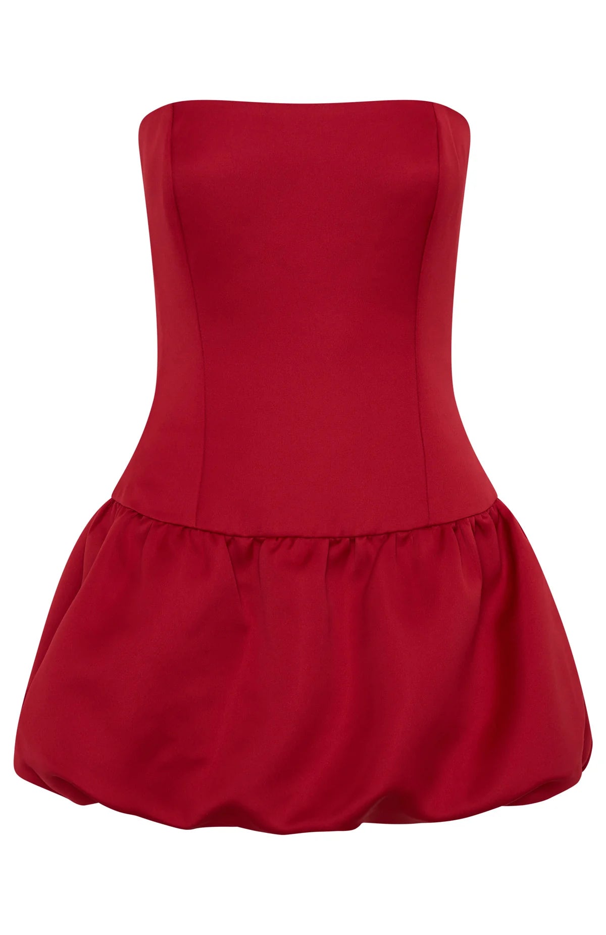 Make an entrance this holiday season in the Sunshine Serenade Mini Dress Red! Features a strapless design, grip-tape, drop-waist fit bodice, structured and thick, lined fabric, gathered bubble skirt design with elastication at hemline for a secure fit, hidden centre back zipper with hook & eye at skirt and a lace up back design with adjustable ties for a desired fit. Style with layered gold jewellery and heels for a xmas day statement.