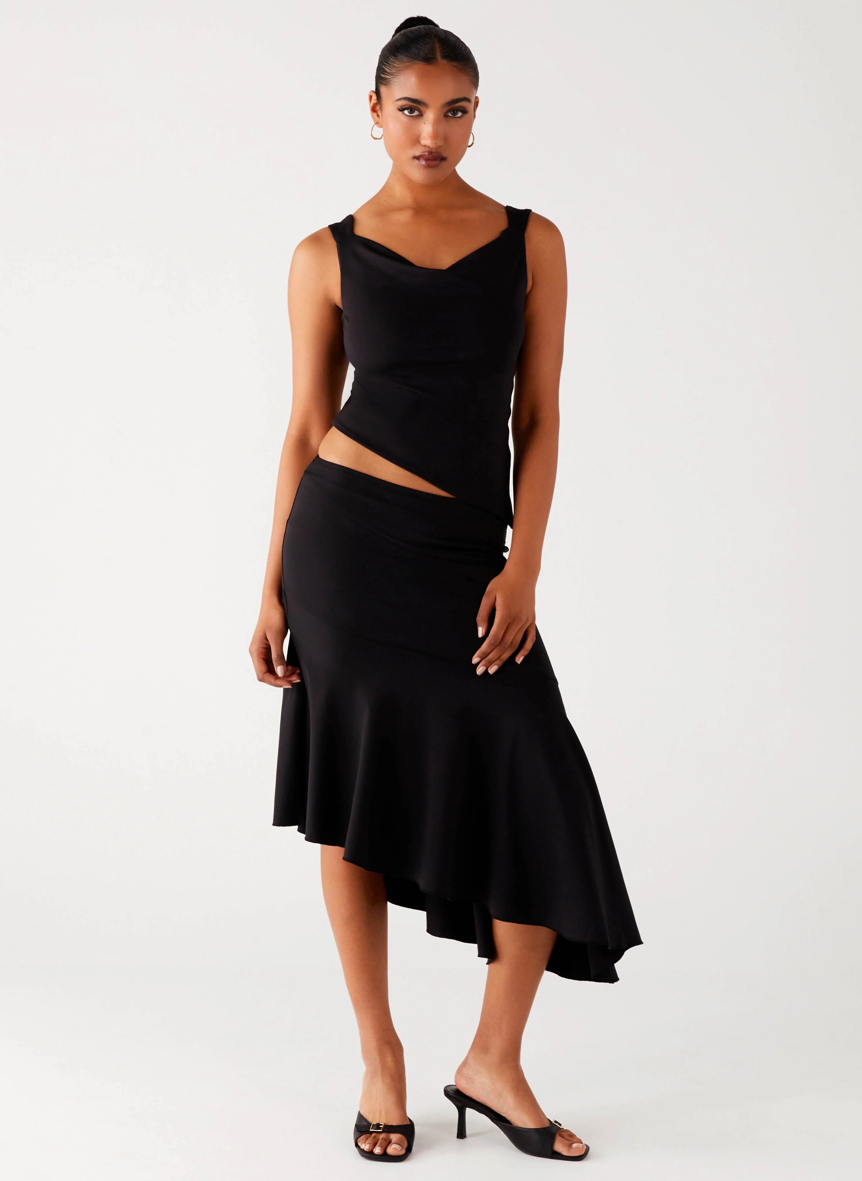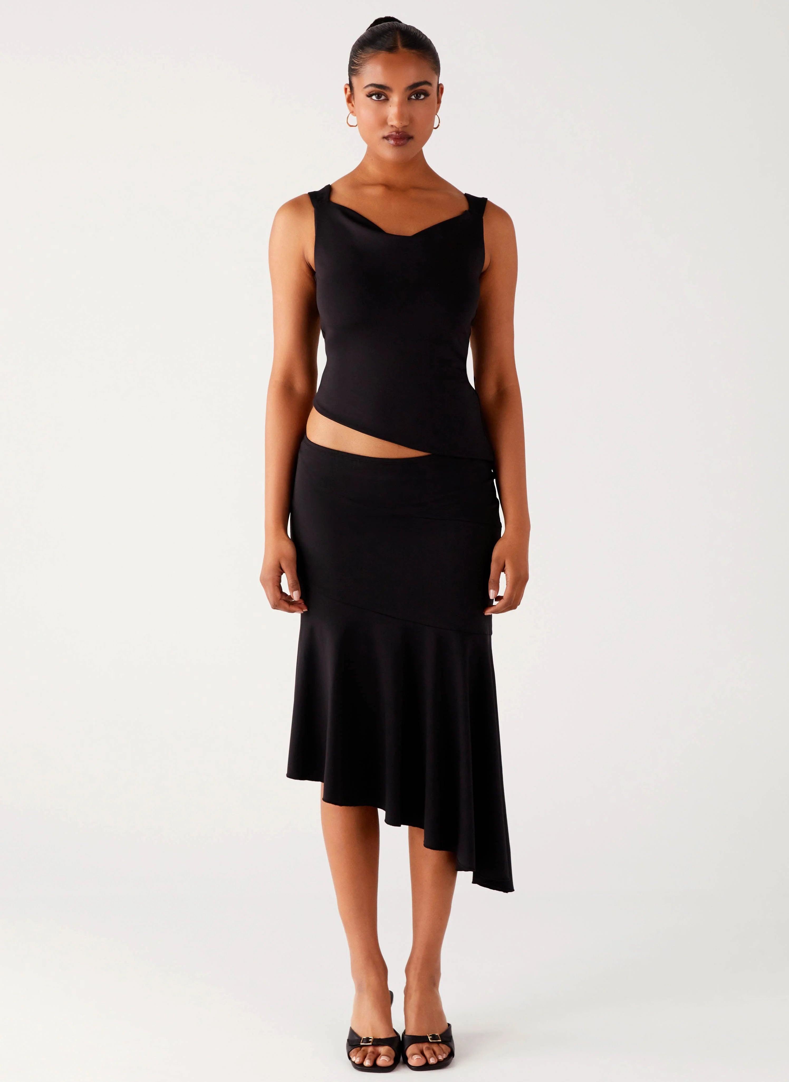 The Wonderlust Midi Skirt is made for those late nights and city lights. With a low-rise fit and asymmetrical hemline, it’s crafted from stretch jersey with an elasticated waistband and self-lined for comfort.